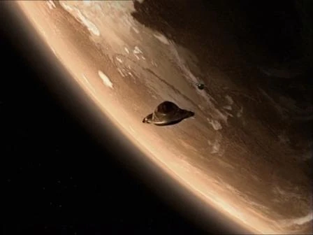 After escaping the Peacekeepers, Moya was able to locate this small Commerce Planet in the Uncharted Territories. The Moya's crew was hoping to find supplies in order to make repairs to Moya. Rygel, Zhaan, and Ka D'Argo headed down to the planet and Rygel bartered with a shop owner for barrels of iriscentant fluid.
