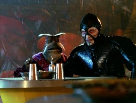 D'Argo and Braca are still lying down, when one alien tries to convince the other to just leave. Rygel explains that they were meeting Peacekeepers to negotiate their freedom – they're prisoners. The aliens try to get Rygel to shoot Braca, since Scorpius is more valuable, as a show of trust. Rygel refuses, as it'll kill D'Argo too and they'd have no one to fly the ship. Instead, Rygel turns and shoots Scorpy, who flies across the room landing behind the bar! The aliens want to leave and when Essk walks past she whispers to Rygel that there's a knife under the tray behind the counter.