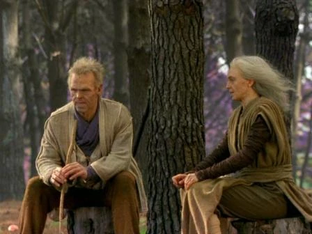 Crichton goes to Aeryn, where the trees they planted are now fully grown. Aeryn tells him to come and sit with her on a tree stump and he tells her he thinks that Ennixx's husband is boring. Aeryn says that she tried to want him to go back. She asks why he hasn't given up his past, but he says he doesn't want to be a gardener and all they do is plant things. Aeryn asks if he regrets spending the last 55 cycles with her. He says that she's the one thing that's kept him alive, but it's hope that keeps him going every day. Aeryn gets a pain in her chest, and as she stands up her locket falls off. She's anxious to get it back and Crichton asks who is in there. She says that he knows, but he doesn't think it's her husband, he thinks it's him. She denies it, and tells him to open it if he doesn't believe her – he'll see his image, the only love of her life. He says no, he doesn't want to see his ugly face.